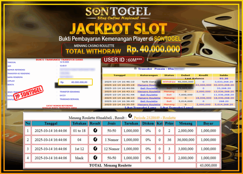 BUKTI JP SONTOGEL – Situs Togel Online, Live Casino dan Slot Online Terpercaya yang terbukti membayar berapapun kemenangan Anda tanpa kekurangan sepeserpun. Jika Anda masih mencari Situs Terpercaya, jangan ragu untuk bermain di SONTOGEL. Dalam 1 akun Anda bisa menikmati semua permainan dengan minimal deposit hanya Rp. 5.000,- saja.