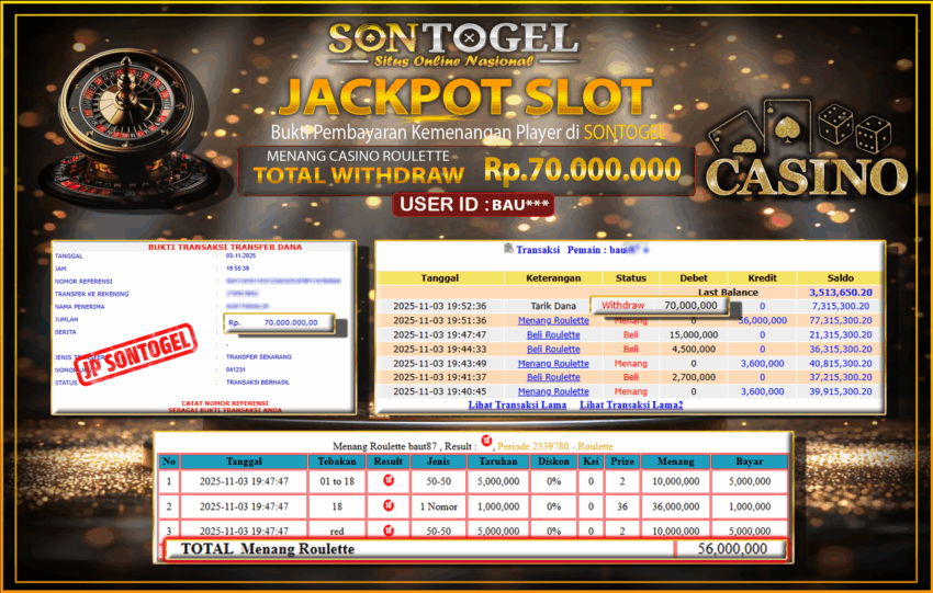 Selamat Kepada Member SONTOGEL dengan USER ID : BAU*** CASINO ROULETTE di provider LIVE GAME sebesar RP.70.000.000,- LUNAS langsung di transfer ke rekening member tanpa kurang sepeserpun. Terimakasih telah mempercayakan SONTOGEL sebagai Situs Online Terpercaya dan Aman! Jangan tunggu tunggu lagi! langsung saja daftarkan akun bermain di SONTOGEL dan dapatkan bonus berlimpah setiap minggunya.