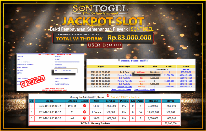 BUKTI JP SONTOGEL – Situs Togel Online, Live Casino dan Slot Online Terpercaya yang terbukti membayar berapapun kemenangan Anda tanpa kekurangan sepeserpun. Jika Anda masih mencari Situs Terpercaya, jangan ragu untuk bermain di SONTOGEL. Dalam 1 akun Anda bisa menikmati semua permainan dengan minimal deposit hanya Rp. 5.000,- saja.