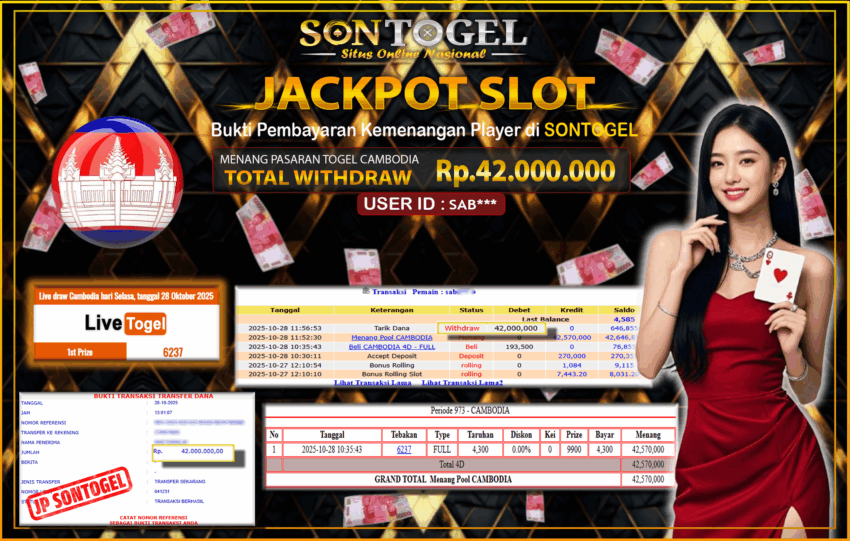 BUKTI JP SONTOGEL – Situs Togel Online, Live Casino dan Slot Online Terpercaya yang terbukti membayar berapapun kemenangan Anda tanpa kekurangan sepeserpun. Jika Anda masih mencari Situs Terpercaya, jangan ragu untuk bermain di SONTOGEL. Dalam 1 akun Anda bisa menikmati semua permainan dengan minimal deposit hanya Rp. 5.000,- saja.