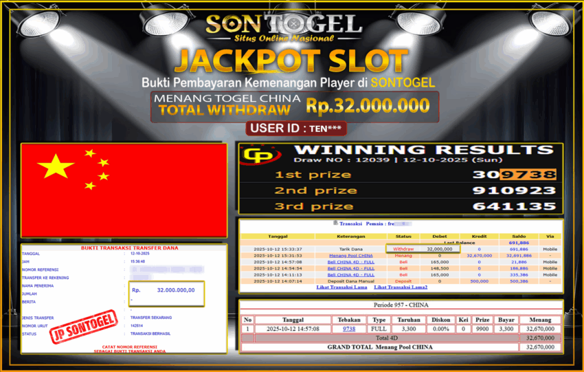 Selamat Kepada Member SONTOGEL dengan USER ID : TEN*** PASARAN TOGEL CHINA sebesar RP.32.000.000,- LUNAS langsung di transfer ke rekening member tanpa kurang sepeserpun. Terimakasih telah mempercayakan SONTOGEL sebagai Situs Online Terpercaya dan Aman! Jangan tunggu tunggu lagi! langsung saja daftarkan akun bermain di SONTOGEL dan dapatkan bonus berlimpah setiap minggunya.