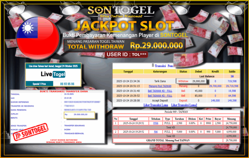 Berikut ini adalah BUKTI JP SONTOGEL yang sudah diproseskan ke rekening member kami