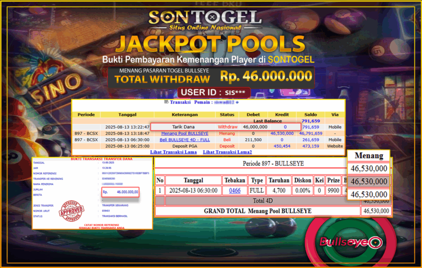 Selamat Kepada Member SONTOGEL dengan USER ID :SIS*** PASARAN TOGEL BULLSEYE sebesar RP.46.000.000,- LUNAS langsung di transfer ke rekening member tanpa kurang sepeserpun. Terimakasih telah mempercayakan SONTOGEL sebagai Situs Online Terpercaya dan Aman! Jangan tunggu tunggu lagi! langsung saja daftarkan akun bermain di SONTOGEL dan dapatkan bonus berlimpah setiap minggunya.