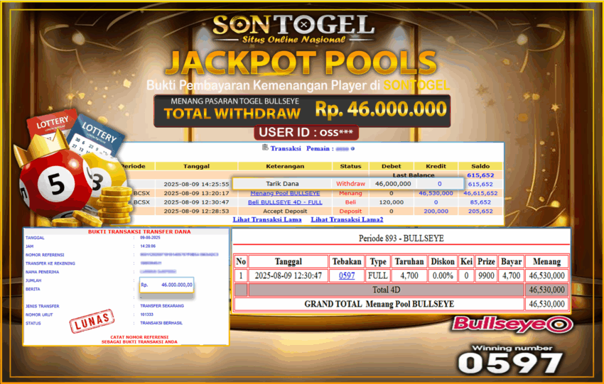 Selamat Kepada Member SONTOGEL dengan USER ID :OSS*** PASARAN TOGEL BULLSEYE sebesar RP.46.000.000,- LUNAS langsung di transfer ke rekening member tanpa kurang sepeserpun. Terimakasih telah mempercayakan SONTOGEL sebagai Situs Online Terpercaya dan Aman! Jangan tunggu tunggu lagi! langsung saja daftarkan akun bermain di SONTOGEL dan dapatkan bonus berlimpah setiap minggunya.