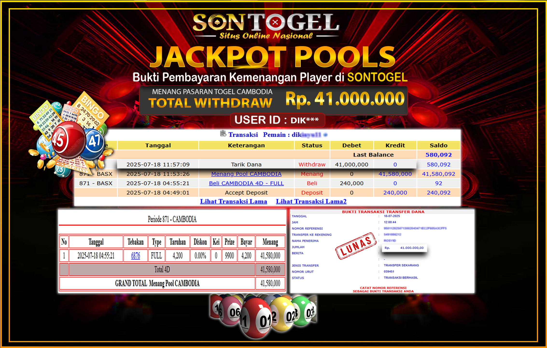 Selamat Kepada Member SONTOGEL dengan USER ID :DIK*** PASARAN TOGEL CAMBODIA sebesar RP.41.000.000,- LUNAS langsung di transfer ke rekening member tanpa kurang sepeserpun. Terimakasih telah mempercayakan SONTOGEL sebagai Situs Online Terpercaya dan Aman! Jangan tunggu tunggu lagi! langsung saja daftarkan akun bermain di SONTOGEL dan dapatkan bonus berlimpah setiap minggunya.