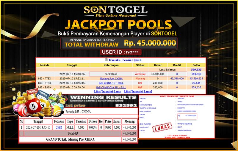 Selamat Kepada Member SONTOGEL dengan USER ID :IYO*** PASARAN TOGEL CHINA sebesar RP.45.000.000,- LUNAS langsung di transfer ke rekening member tanpa kurang sepeserpun. Terimakasih telah mempercayakan SONTOGEL sebagai Situs Online Terpercaya dan Aman! Jangan tunggu tunggu lagi! langsung saja daftarkan akun bermain di SONTOGEL dan dapatkan bonus berlimpah setiap minggunya.