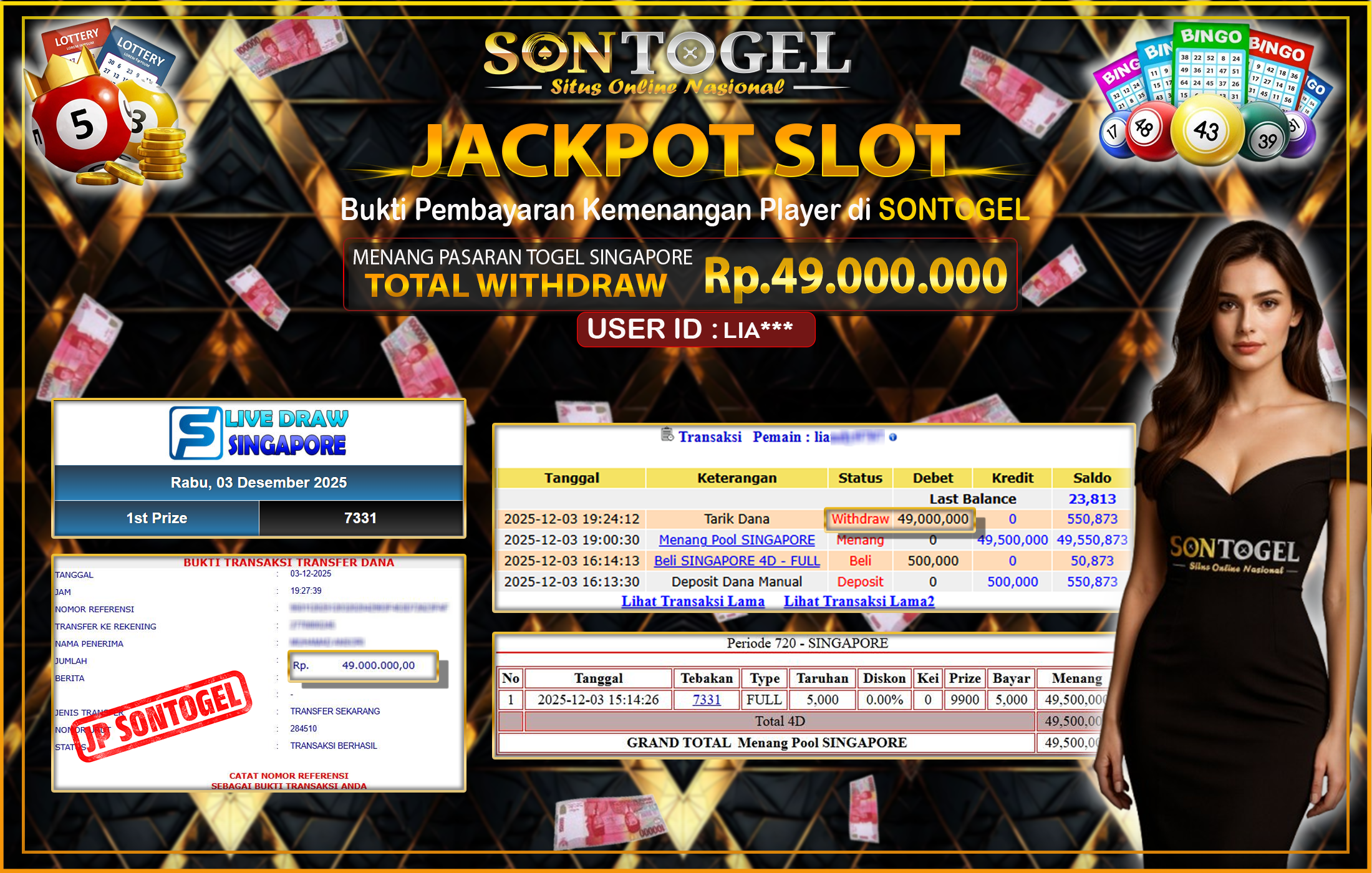 BUKTI JP SONTOGEL – Situs Togel Online, Live Casino dan Slot Online Terpercaya yang terbukti membayar berapapun kemenangan Anda tanpa kekurangan sepeserpun. Jika Anda masih mencari Situs Terpercaya,  jangan ragu untuk bermain di SONTOGEL. Dalam 1 akun Anda bisa menikmati semua permainan dengan minimal deposit hanya Rp. 5.000,- saja.