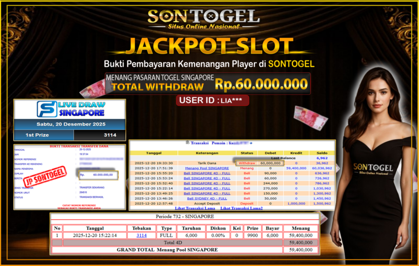BUKTI JP SONTOGEL – Situs Togel Online, Live Casino dan Slot Online Terpercaya yang terbukti membayar berapapun kemenangan Anda tanpa kekurangan sepeserpun. Jika Anda masih mencari Situs Terpercaya,  jangan ragu untuk bermain di SONTOGEL. Dalam 1 akun Anda bisa menikmati semua permainan dengan minimal deposit hanya Rp. 5.000,- saja.