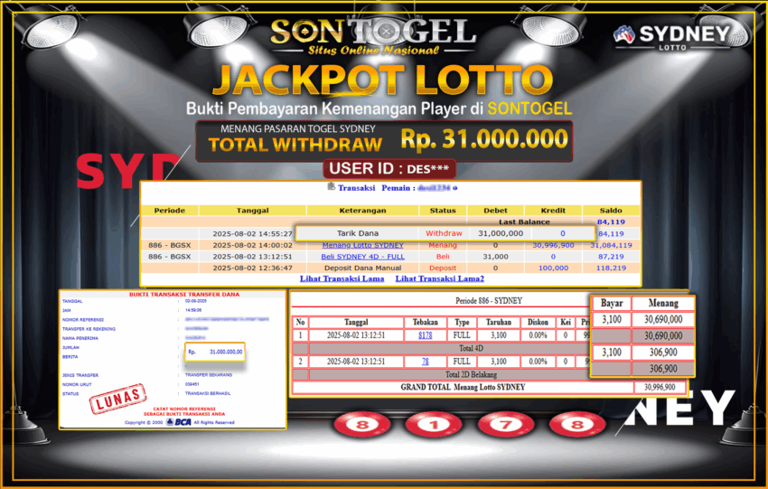 Selamat Kepada Member SONTOGEL dengan USER ID :DES*** PASARAN TOGEL SYDNEY sebesar RP.31.000.000,- LUNAS langsung di transfer ke rekening member tanpa kurang sepeserpun. Terimakasih telah mempercayakan SONTOGEL sebagai Situs Online Terpercaya dan Aman! Jangan tunggu tunggu lagi! langsung saja daftarkan akun bermain di SONTOGEL dan dapatkan bonus berlimpah setiap minggunya.