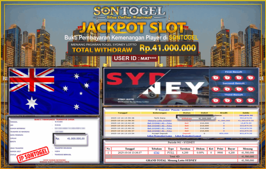 Selamat Kepada Member SONTOGEL dengan USER ID : MAT*** PASARAN TOGEL SYDNEY sebesar RP.41.000.000,- LUNAS langsung di transfer ke rekening member tanpa kurang sepeserpun. Terimakasih telah mempercayakan SONTOGEL sebagai Situs Online Terpercaya dan Aman! Jangan tunggu tunggu lagi! langsung saja daftarkan akun bermain di SONTOGEL dan dapatkan bonus berlimpah setiap minggunya.
