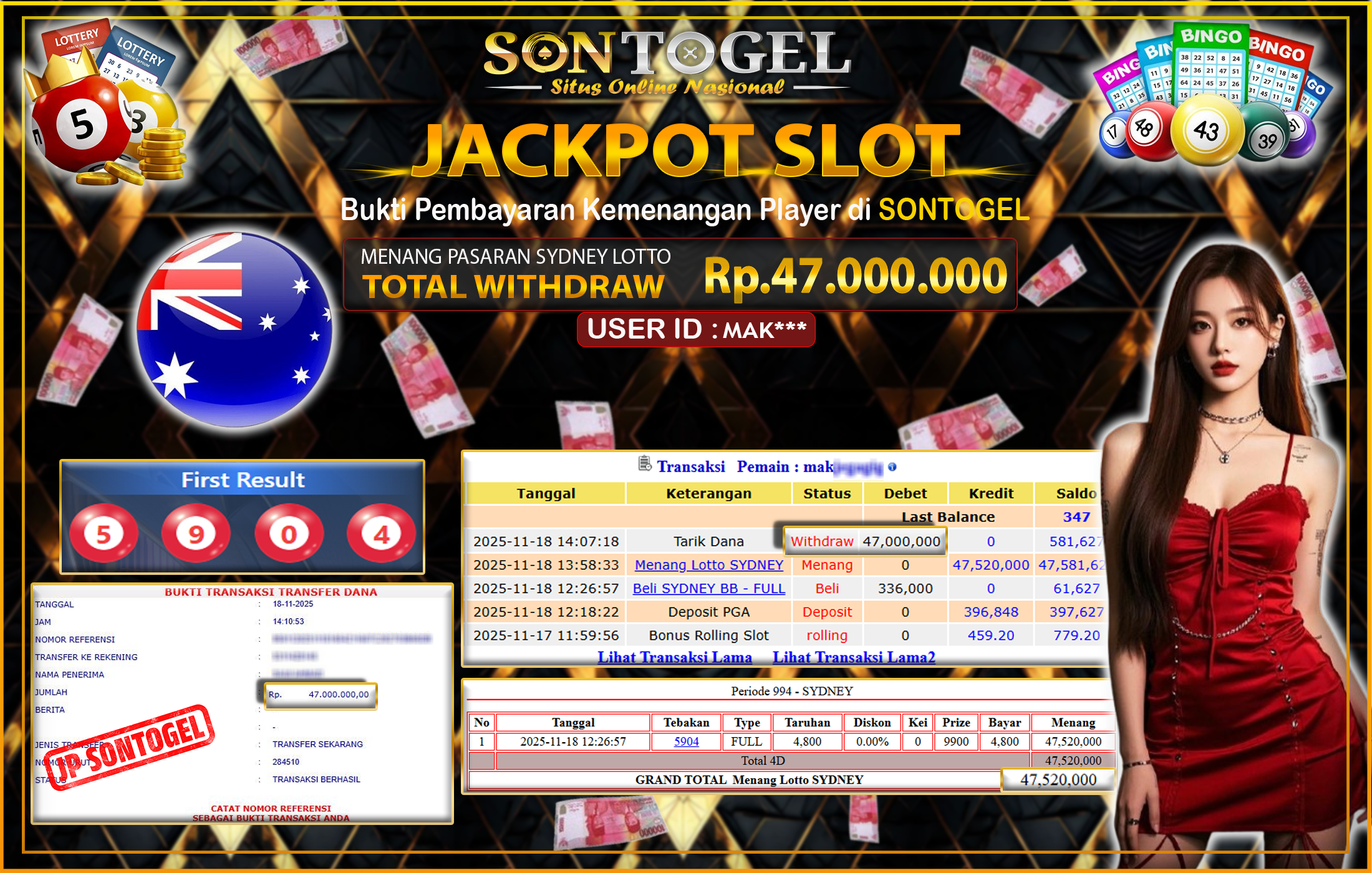 BUKTI JP SONTOGEL – Situs Togel Online, Live Casino dan Slot Online Terpercaya yang terbukti membayar berapapun kemenangan Anda tanpa kekurangan sepeserpun. Jika Anda masih mencari Situs Terpercaya, jangan ragu untuk bermain di SONTOGEL. Dalam 1 akun Anda bisa menikmati semua permainan dengan minimal deposit hanya Rp. 5.000,- saja.