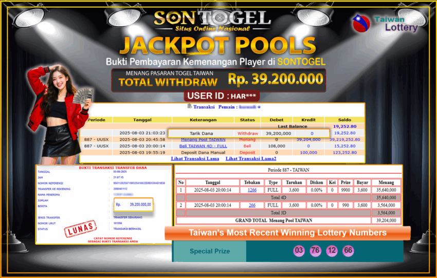 Selamat Kepada Member SONTOGEL dengan USER ID :HAR*** PASARAN TOGEL TAIWANsebesar RP.39.200.000,- LUNAS langsung di transfer ke rekening member tanpa kurang sepeserpun. Terimakasih telah mempercayakan SONTOGEL sebagai Situs Online Terpercaya dan Aman! Jangan tunggu tunggu lagi! langsung saja daftarkan akun bermain di SONTOGEL dan dapatkan bonus berlimpah setiap minggunya.