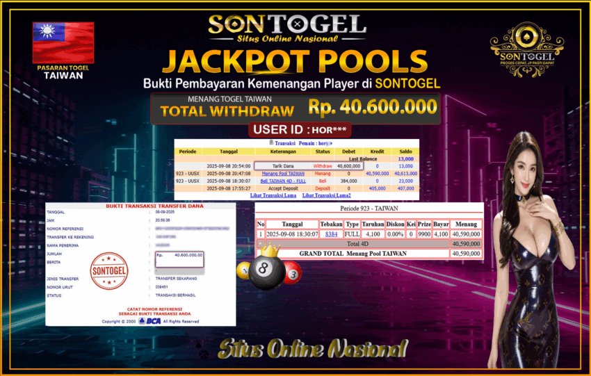 Selamat Kepada Member SONTOGEL dengan USER ID :HOR*** PASARAN TOGEL TAIWAN sebesar RP.40.600.000,- LUNAS langsung di transfer ke rekening member tanpa kurang sepeserpun. Terimakasih telah mempercayakan SONTOGEL sebagai Situs Online Terpercaya dan Aman! Jangan tunggu tunggu lagi! langsung saja daftarkan akun bermain di SONTOGEL dan dapatkan bonus berlimpah setiap minggunya.