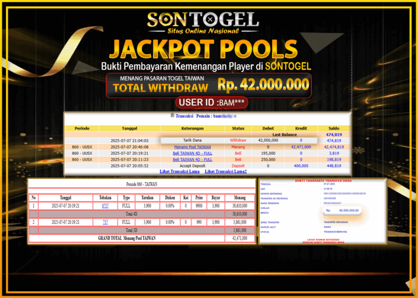Selamat Kepada Member SONTOGEL dengan USER ID :BAM*** PASARAN TOGEL TAIWAN sebesar RP.42.000.000,- LUNAS langsung di transfer ke rekening member tanpa kurang sepeserpun. Terimakasih telah mempercayakan SONTOGEL sebagai Situs Online Terpercaya dan Aman! Jangan tunggu tunggu lagi! langsung saja daftarkan akun bermain di SONTOGEL dan dapatkan bonus berlimpah setiap minggunya.