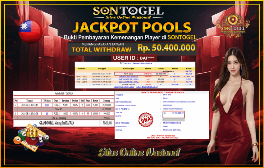 BUKTI JP SONTOGEL – Situs Togel Online, Live Casino dan Slot Online Terpercaya yang terbukti membayar berapapun kemenangan Anda tanpa kekurangan sepeserpun. Jika Anda masih mencari Situs Terpercaya, jangan ragu untuk bermain di SONTOGEL. Dalam 1 akun Anda bisa menikmati semua permainan dengan minimal deposit hanya Rp. 5.000,- saja.