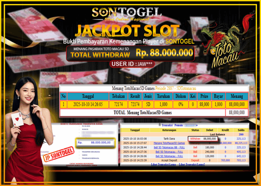 BUKTI JP SONTOGEL – Situs Togel Online, Live Casino dan Slot Online Terpercaya yang terbukti membayar berapapun kemenangan Anda tanpa kekurangan sepeserpun. Jika Anda masih mencari Situs Terpercaya, jangan ragu untuk bermain di SONTOGEL. Dalam 1 akun Anda bisa menikmati semua permainan dengan minimal deposit hanya Rp. 5.000,- saja.