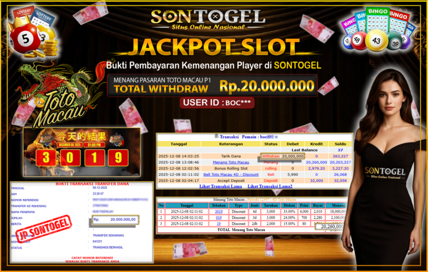 BUKTI JP SONTOGEL – Situs Togel Online, Live Casino dan Slot Online Terpercaya yang terbukti membayar berapapun kemenangan Anda tanpa kekurangan sepeserpun. Jika Anda masih mencari Situs Terpercaya,  jangan ragu untuk bermain di SONTOGEL. Dalam 1 akun Anda bisa menikmati semua permainan dengan minimal deposit hanya Rp. 5.000,- saja.