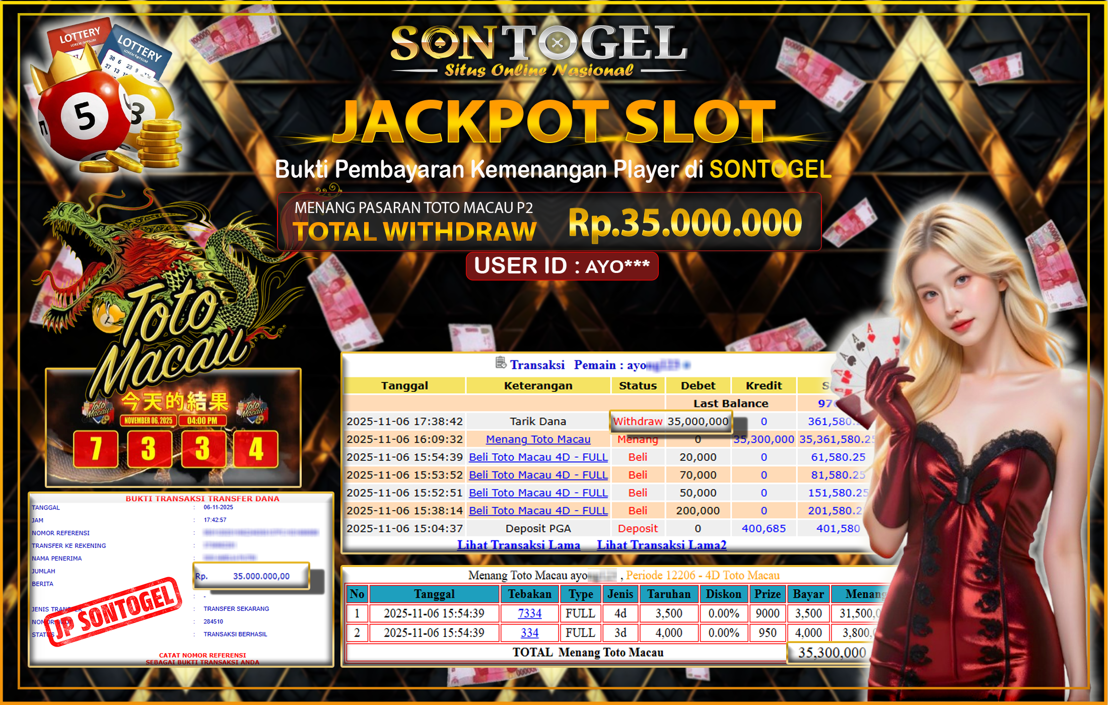 Berikut ini adalah BUKTI JP SONTOGEL yang sudah diproseskan ke rekening member kami