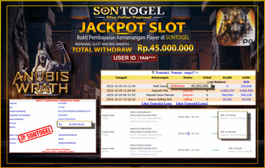 Selamat Kepada Member SONTOGEL dengan USER ID : TAN*** SLOT ANUBIS WRATH di PG SOFT sebesar RP.45.000.000,- LUNAS langsung di transfer ke rekening member tanpa kurang sepeserpun. Terimakasih telah mempercayakan SONTOGEL sebagai Situs Online Terpercaya dan Aman! Jangan tunggu tunggu lagi! langsung saja daftarkan akun bermain di SONTOGEL dan dapatkan bonus berlimpah setiap minggunya.
