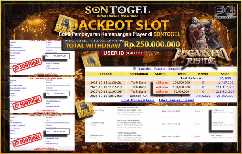 Selamat Kepada Member SONTOGEL dengan USER ID : KHU*** SLOT ASGARDIAN RISING di provider PG Soft sebesar RP.250.000.000,- LUNAS langsung di transfer ke rekening member tanpa kurang sepeserpun. Terimakasih telah mempercayakan SONTOGEL sebagai Situs Online Terpercaya dan Aman! Jangan tunggu tunggu lagi! langsung saja daftarkan akun bermain di SONTOGEL dan dapatkan bonus berlimpah setiap minggunya.