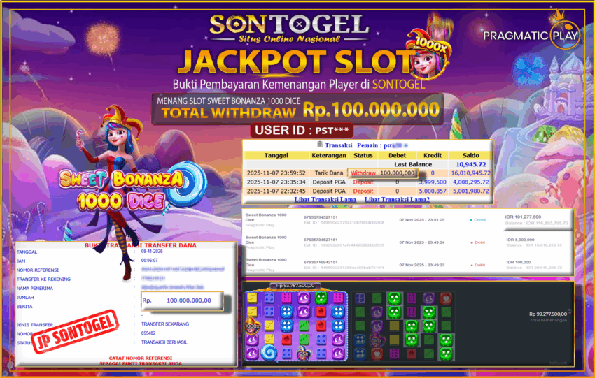 Selamat Kepada Member SONTOGEL dengan USER ID : PST*** SLOT BONANZA 1000 DICE di PRAGMATIC sebesar RP.100.000.000,- LUNAS langsung di  transfer ke rekening member tanpa kurang sepeserpun. Terimakasih telah mempercayakan SONTOGEL sebagai Situs Online Terpercaya dan Aman! Jangan tunggu tunggu lagi! langsung saja daftarkan akun bermain di SONTOGEL dan dapatkan bonus berlimpah setiap minggunya.