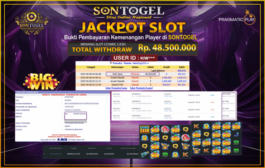 Selamat Kepada Member SONTOGEL dengan USER ID : KIW*** SLOT COSMIC CASH di PRAGMATIC sebesar RP.48.500.000,- LUNAS langsung di transfer ke rekening member tanpa kurang sepeserpun. Terimakasih telah mempercayakan SONTOGEL sebagai Situs Online Terpercaya dan Aman! Jangan tunggu tunggu lagi! langsung saja daftarkan akun bermain di SONTOGEL dan dapatkan bonus berlimpah setiap minggunya.