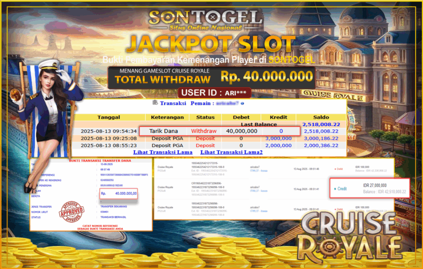 Selamat Kepada Member SONTOGEL dengan USER ID : ARI*** SLOT CRUISE ROYALE di PG Soft Play sebesar RP.40.000.000,- LUNAS langsung di  transfer ke rekening member tanpa kurang sepeserpun. Terimakasih telah mempercayakan SONTOGEL sebagai Situs Online Terpercaya dan Aman! Jangan tunggu tunggu lagi! langsung saja daftarkan akun bermain di SONTOGEL dan dapatkan bonus berlimpah setiap minggunya.