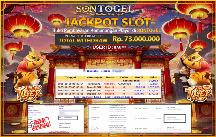 Selamat Kepada Member SONTOGEL dengan USER ID : BAU*** SLOT FORTUNE TIGER di provider PG Soft sebesar RP.73.000.000,- LUNAS langsung di  transfer ke rekening member tanpa kurang sepeserpun. Terimakasih telah mempercayakan SONTOGEL sebagai Situs Online Terpercaya dan Aman! Jangan tunggu tunggu lagi! langsung saja daftarkan akun bermain di SONTOGEL dan dapatkan bonus berlimpah setiap minggunya.