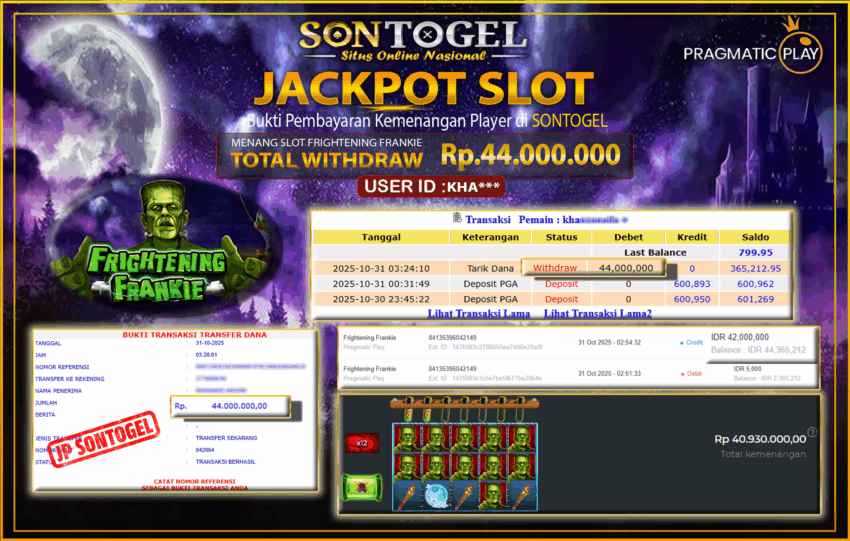Selamat Kepada Member SONTOGEL dengan USER ID : KHA*** SLOT FRIGHTENING FRANKIE di PRAGMATIC sebesar RP.44.000.000,- LUNAS langsung di transfer ke rekening member tanpa kurang sepeserpun. Terimakasih telah mempercayakan SONTOGEL sebagai Situs Online Terpercaya dan Aman! Jangan tunggu tunggu lagi! langsung saja daftarkan akun bermain di SONTOGEL dan dapatkan bonus berlimpah setiap minggunya.