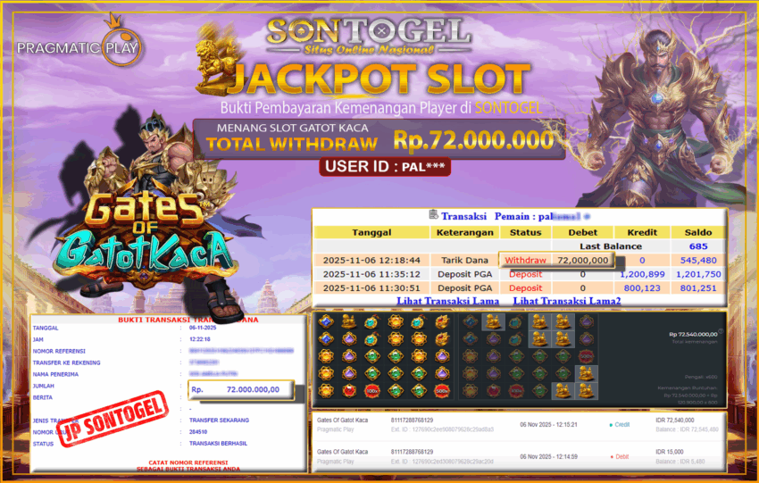 Selamat Kepada Member SONTOGEL dengan USER ID : PAL*** SLOT GATES OF GATOT KACA di Pragmatic Play sebesar RP.72.000.000,- LUNAS langsung di transfer ke rekening member tanpa kurang sepeserpun. Terimakasih telah mempercayakan SONTOGEL sebagai Situs Online Terpercaya dan Aman! Jangan tunggu tunggu lagi! langsung saja daftarkan akun bermain di SONTOGEL dan dapatkan bonus berlimpah setiap minggunya.
