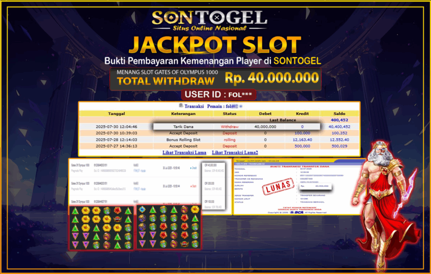 Selamat Kepada Member SONTOGEL dengan USER ID : FOL*** SLOT GATES OF OLYMPUS 1000 di provider Pragmatic Play sebesar RP.40.000.000,- LUNAS langsung di transfer ke rekening member tanpa kurang sepeserpun. Terimakasih telah mempercayakan SONTOGEL sebagai Situs Online Terpercaya dan Aman! Jangan tunggu tunggu lagi! langsung saja daftarkan akun bermain di SONTOGEL dan dapatkan bonus berlimpah setiap minggunya.