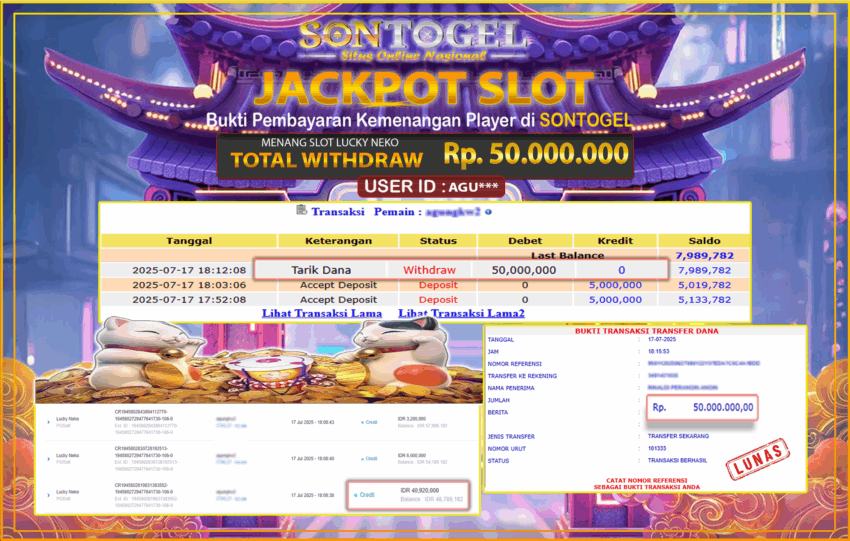 Selamat Kepada Member SONTOGEL dengan USER ID : AGU*** SLOT LUCKY NEKO di provider PG Soft sebesar RP.50.000.000,- LUNAS langsung di transfer ke rekening member tanpa kurang sepeserpun. Terimakasih telah mempercayakan SONTOGEL sebagai Situs Online Terpercaya dan Aman! Jangan tunggu tunggu lagi! langsung saja daftarkan akun bermain di SONTOGEL dan dapatkan bonus berlimpah setiap minggunya.