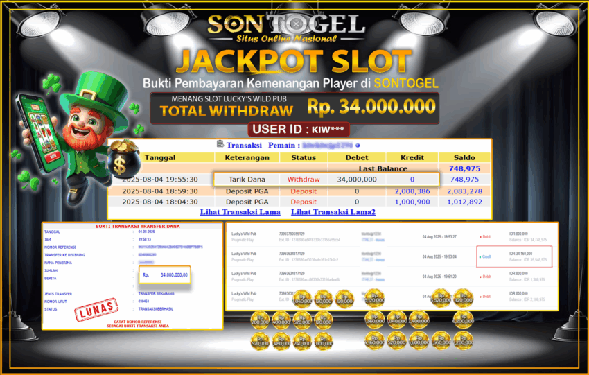 Selamat Kepada Member SONTOGEL dengan USER ID : KIW*** SLOT LUCKY’S WILD PUB di provider Pragmatic Play sebesar RP.34.000.000,- LUNAS langsung di transfer ke rekening member tanpa kurang sepeserpun. Terimakasih telah mempercayakan SONTOGEL sebagai Situs Online Terpercaya dan Aman! Jangan tunggu tunggu lagi! langsung saja daftarkan akun bermain di SONTOGEL dan dapatkan bonus berlimpah setiap minggunya.