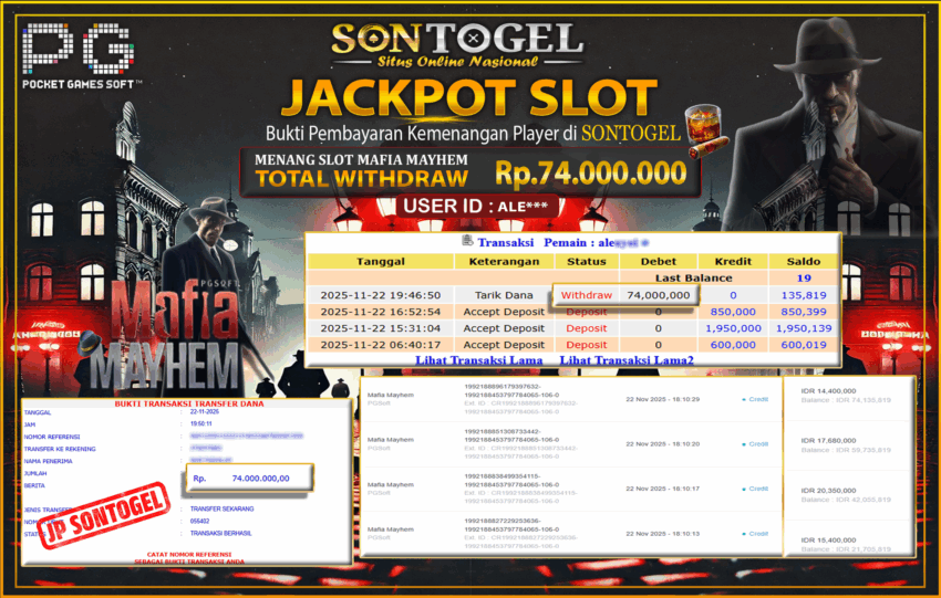 Selamat Kepada Member SONTOGEL dengan USER ID : ALE*** SLOT MAFIA MAYHEM di provider Pragmatic Play sebesar RP.74.000.000,- LUNAS langsung di transfer ke rekening member tanpa kurang sepeserpun. Terimakasih telah mempercayakan SONTOGEL sebagai Situs Online Terpercaya dan Aman! Jangan tunggu tunggu lagi! langsung saja daftarkan akun bermain di SONTOGEL dan dapatkan bonus berlimpah setiap minggunya.