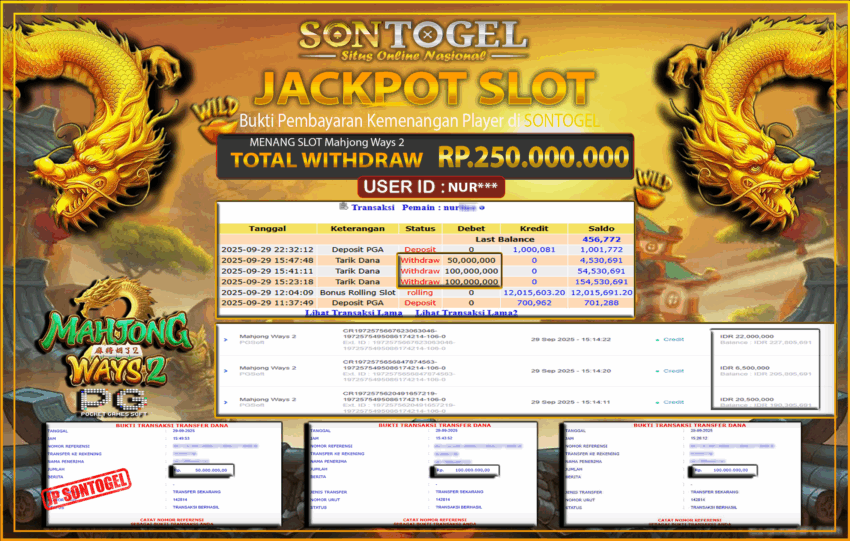 Selamat Kepada Member SONTOGEL dengan USER ID : NUR*** SLOT MAHJONG WAYS 2 di provider PG Soft sebesar RP.250.000.000,- LUNAS langsung di  transfer ke rekening member tanpa kurang sepeserpun. Terimakasih telah mempercayakan SONTOGEL sebagai Situs Online Terpercaya dan Aman! Jangan tunggu tunggu lagi! langsung saja daftarkan akun bermain di SONTOGEL dan dapatkan bonus berlimpah setiap minggunya.