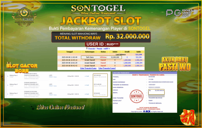 Selamat Kepada Member SONTOGEL dengan USER ID : RUD*** SLOT MAHJONG WAYS di PG SOFT sebesar RP.32.000.000,- LUNAS langsung di transfer ke rekening member tanpa kurang sepeserpun. Terimakasih telah mempercayakan SONTOGEL sebagai Situs Online Terpercaya dan Aman! Jangan tunggu tunggu lagi! langsung saja daftarkan akun bermain di SONTOGEL dan dapatkan bonus berlimpah setiap minggunya.