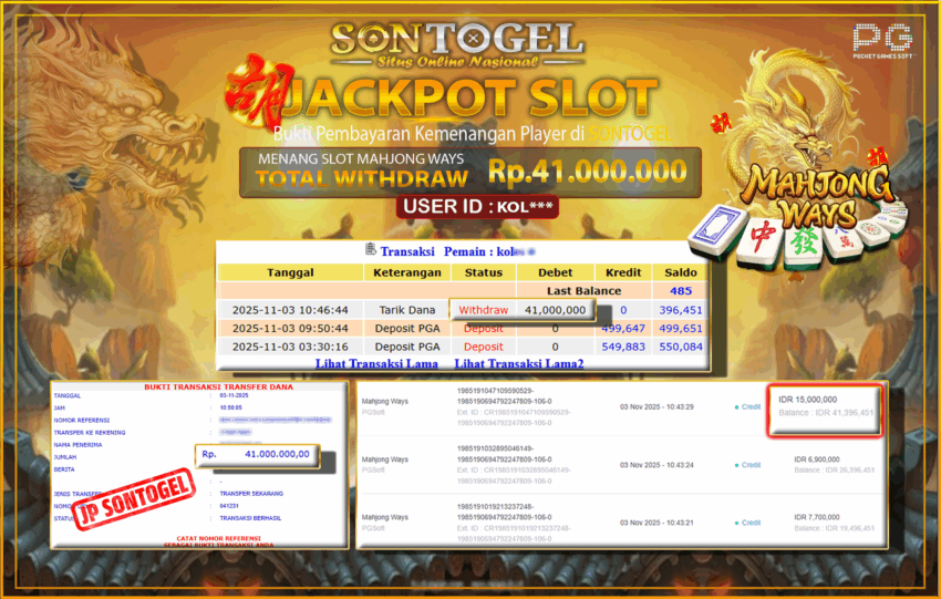 Selamat Kepada Member SONTOGEL dengan USER ID : KOL*** SLOT MAHJONG WAYS di provider PG Soft sebesar RP.41.000.000,- LUNAS langsung di transfer ke rekening member tanpa kurang sepeserpun. Terimakasih telah mempercayakan SONTOGEL sebagai Situs Online Terpercaya dan Aman! Jangan tunggu tunggu lagi! langsung saja daftarkan akun bermain di SONTOGEL dan dapatkan bonus berlimpah setiap minggunya.
