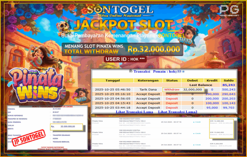 Selamat Kepada Member SONTOGEL dengan USER ID : HOK*** SLOT PINATA WINS di provider PG Soft sebesar RP.32.000.000,- LUNAS langsung di transfer ke rekening member tanpa kurang sepeserpun. Terimakasih telah mempercayakan SONTOGEL sebagai Situs Online Terpercaya dan Aman! Jangan tunggu tunggu lagi! langsung saja daftarkan akun bermain di SONTOGEL dan dapatkan bonus berlimpah setiap minggunya.