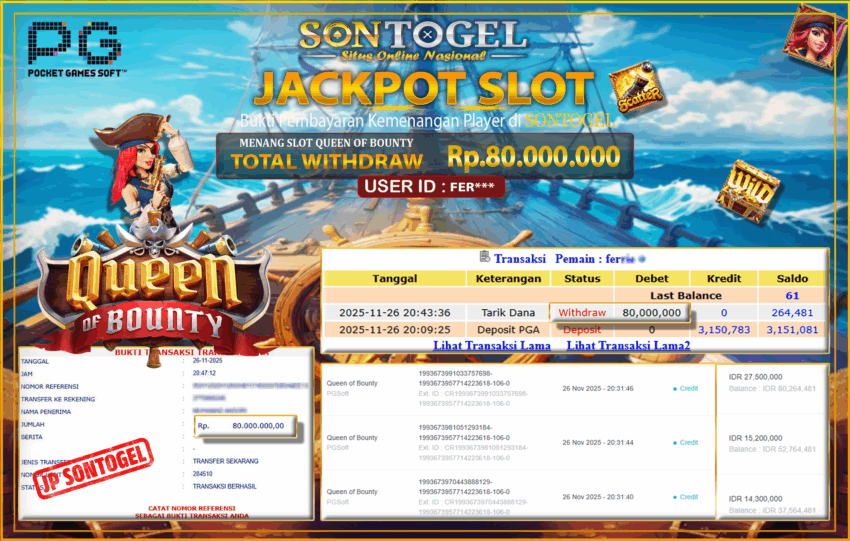 Berikut ini adalah BUKTI JP SONTOGEL yang sudah diproseskan ke rekening member kami