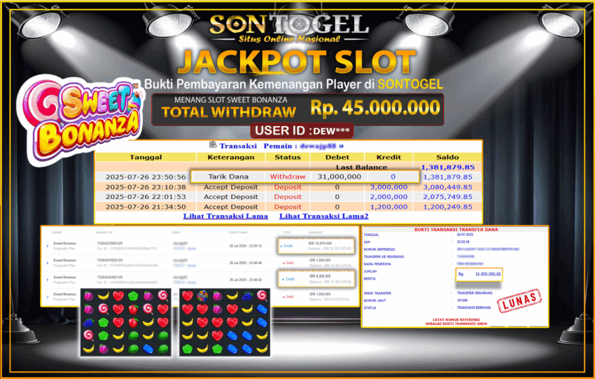 Berikut ini adalah BUKTI JP SONTOGEL yang sudah diproseskan ke rekening member kami