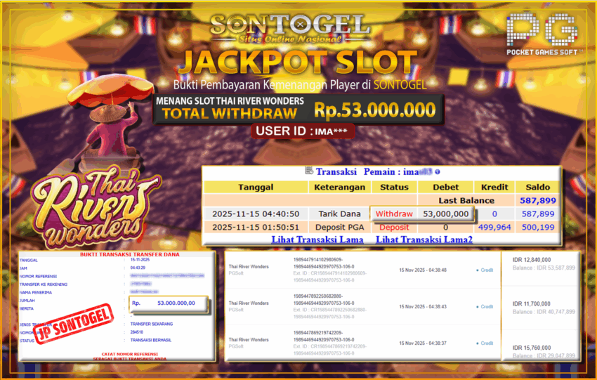 Selamat Kepada Member SONTOGEL dengan USER ID : IMA*** SLOT THAI RIVER WONDERS di provider PG Soft sebesar RP.53.000.000,- LUNAS langsung di transfer ke rekening member tanpa kurang sepeserpun. Terimakasih telah mempercayakan SONTOGEL sebagai Situs Online Terpercaya dan Aman! Jangan tunggu tunggu lagi! langsung saja daftarkan akun bermain di SONTOGEL dan dapatkan bonus berlimpah setiap minggunya.