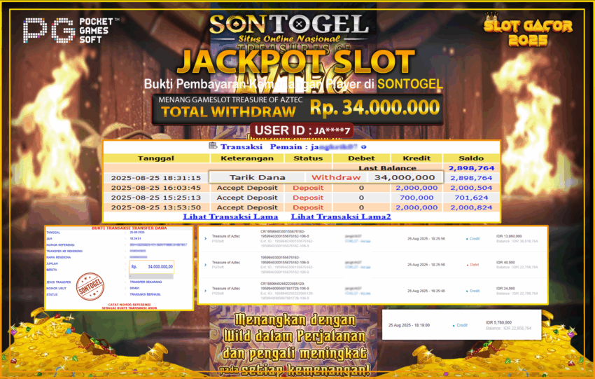 Selamat Kepada Member SONTOGEL dengan USER ID : JAN*** SLOT TREASURE OF AZTEC di PG Soft sebesar RP.34.000.000,- LUNAS langsung di transfer ke rekening member tanpa kurang sepeserpun. Terimakasih telah mempercayakan SONTOGEL sebagai Situs Online Terpercaya dan Aman! Jangan tunggu tunggu lagi! langsung saja daftarkan akun bermain di SONTOGEL dan dapatkan bonus berlimpah setiap minggunya.