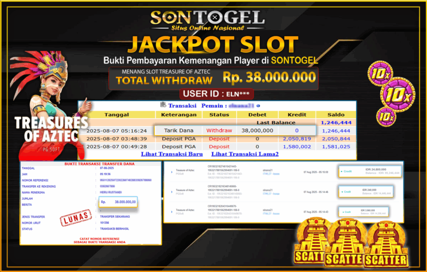 Selamat Kepada Member SONTOGEL dengan USER ID : ELN*** SLOT TREASURE OF AZTEC di PG Soft Play sebesar RP.38.000.000,- LUNAS langsung di transfer ke rekening member tanpa kurang sepeserpun. Terimakasih telah mempercayakan SONTOGEL sebagai Situs Online Terpercaya dan Aman! Jangan tunggu tunggu lagi! langsung saja daftarkan akun bermain di SONTOGEL dan dapatkan bonus berlimpah setiap minggunya.