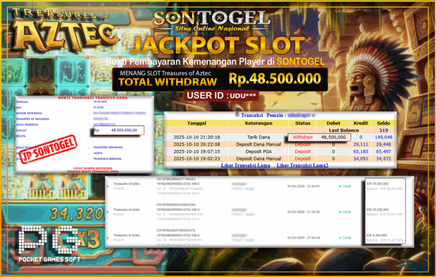Selamat Kepada Member SONTOGEL dengan USER ID : UDU*** SLOT TREASURES OF AZTEC di provider PG Soft sebesar RP.48.500.000,- LUNAS langsung di transfer ke rekening member tanpa kurang sepeserpun. Terimakasih telah mempercayakan SONTOGEL sebagai Situs Online Terpercaya dan Aman! Jangan tunggu tunggu lagi! langsung saja daftarkan akun bermain di SONTOGEL dan dapatkan bonus berlimpah setiap minggunya.