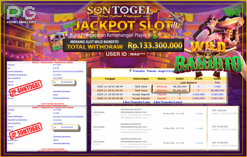 Selamat Kepada Member SONTOGEL dengan USER ID : MAG*** SLOT WILD BANDITO di PG SOFT sebesar RP.133.300.000,- LUNAS langsung di transfer ke rekening member tanpa kurang sepeserpun. Terimakasih telah mempercayakan SONTOGEL sebagai Situs Online Terpercaya dan Aman! Jangan tunggu tunggu lagi! langsung saja daftarkan akun bermain di SONTOGEL dan dapatkan bonus berlimpah setiap minggunya.