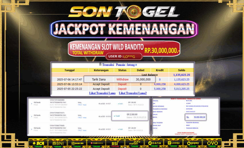 Selamat Kepada Member SONTOGEL dengan USER ID : LOT*** SLOT WILD BANDITO di provider PG Soft sebesar RP.32.000.000,- LUNAS langsung di  transfer ke rekening member tanpa kurang sepeserpun. Terimakasih telah mempercayakan SONTOGEL sebagai Situs Online Terpercaya dan Aman! Jangan tunggu tunggu lagi! langsung saja daftarkan akun bermain di SONTOGEL dan dapatkan bonus berlimpah setiap minggunya.