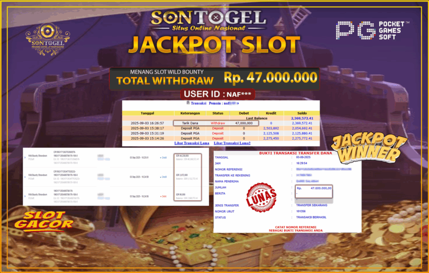 Selamat Kepada Member SONTOGEL dengan USER ID : NAF*** SLOT WILD BOUNTY di PG Soft sebesar RP.47.000.000,- LUNAS langsung di transfer ke rekening member tanpa kurang sepeserpun. Terimakasih telah mempercayakan SONTOGEL sebagai Situs Online Terpercaya dan Aman! Jangan tunggu tunggu lagi! langsung saja daftarkan akun bermain di SONTOGEL dan dapatkan bonus berlimpah setiap minggunya.